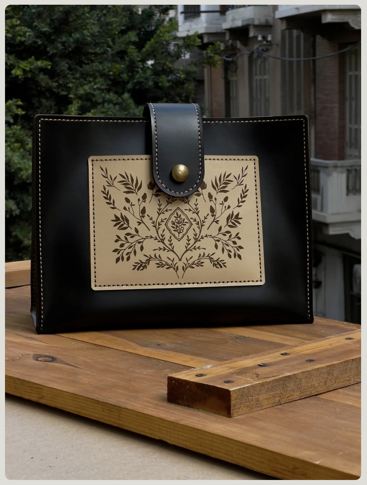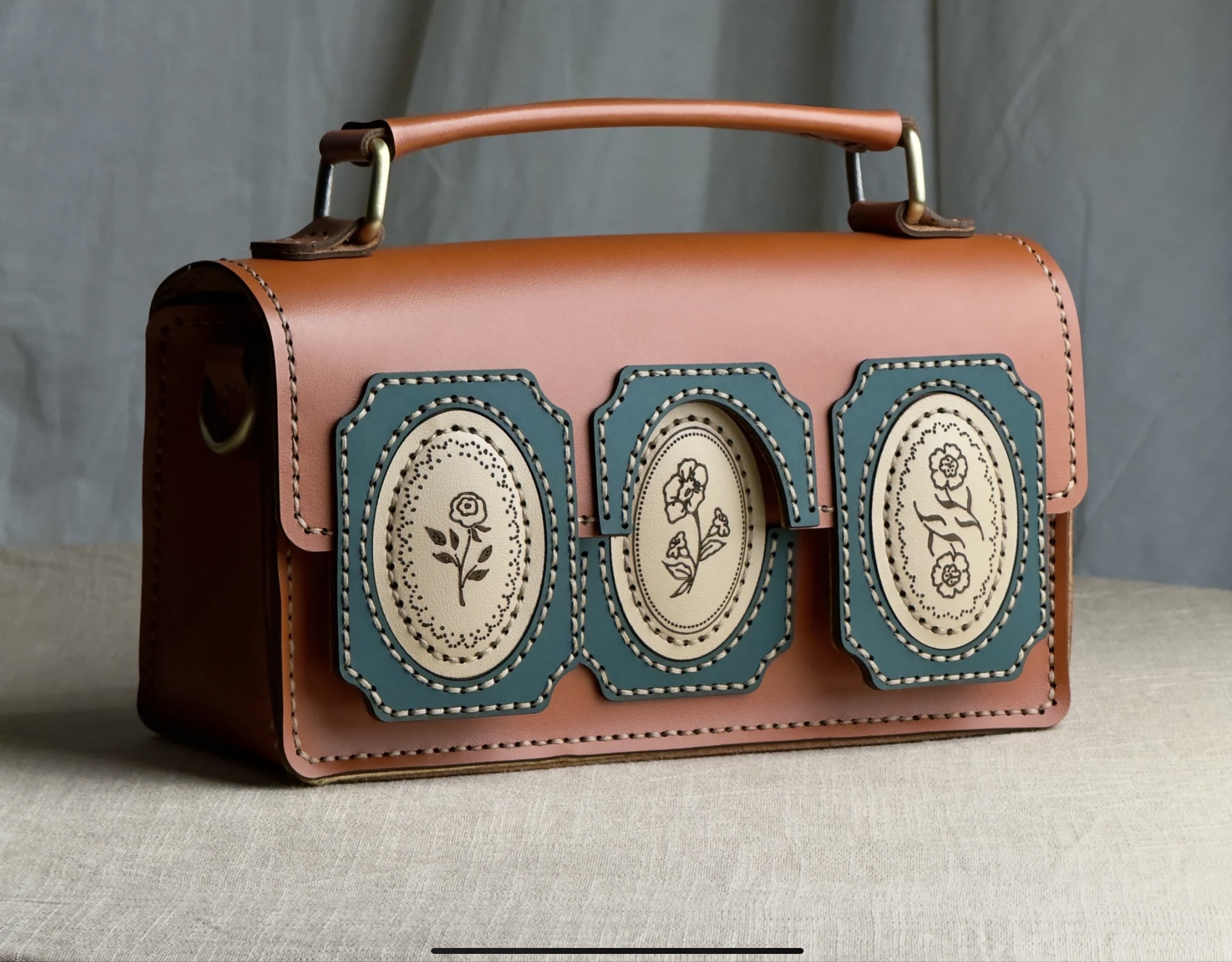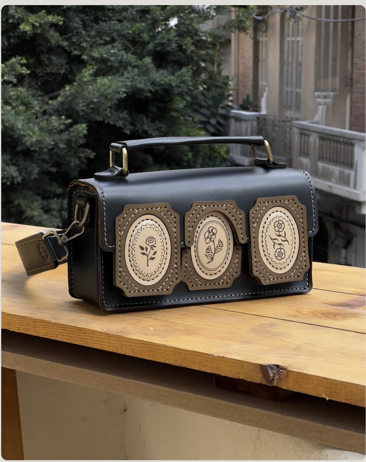 HandleRigid leather handle — hand-stitched